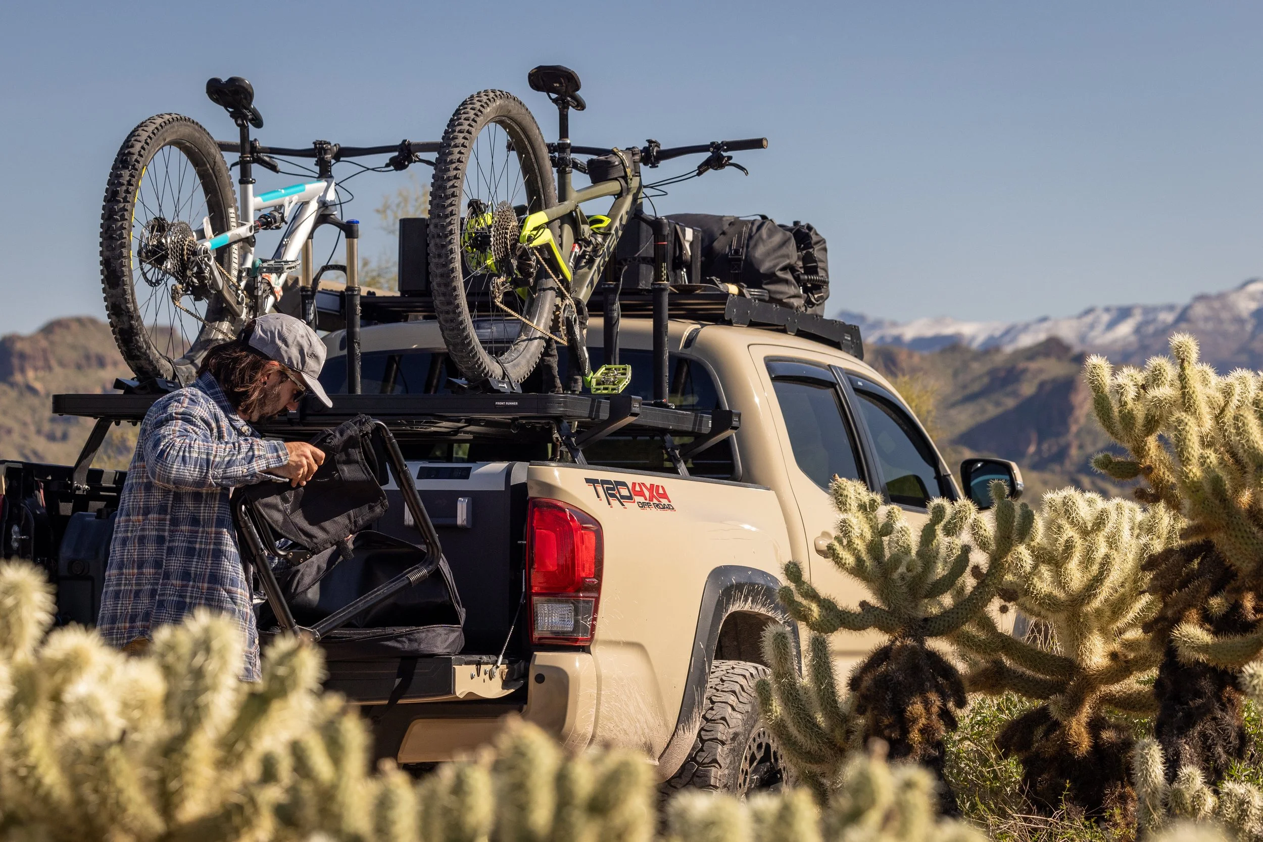 The Slimline II bed rack replaces traditional camper shells or tonneau covers, giving you a modular gear platform above the bed rails. It mounts directly to the bed using proprietary brackets and supports rooftop accessories like tents and tables.